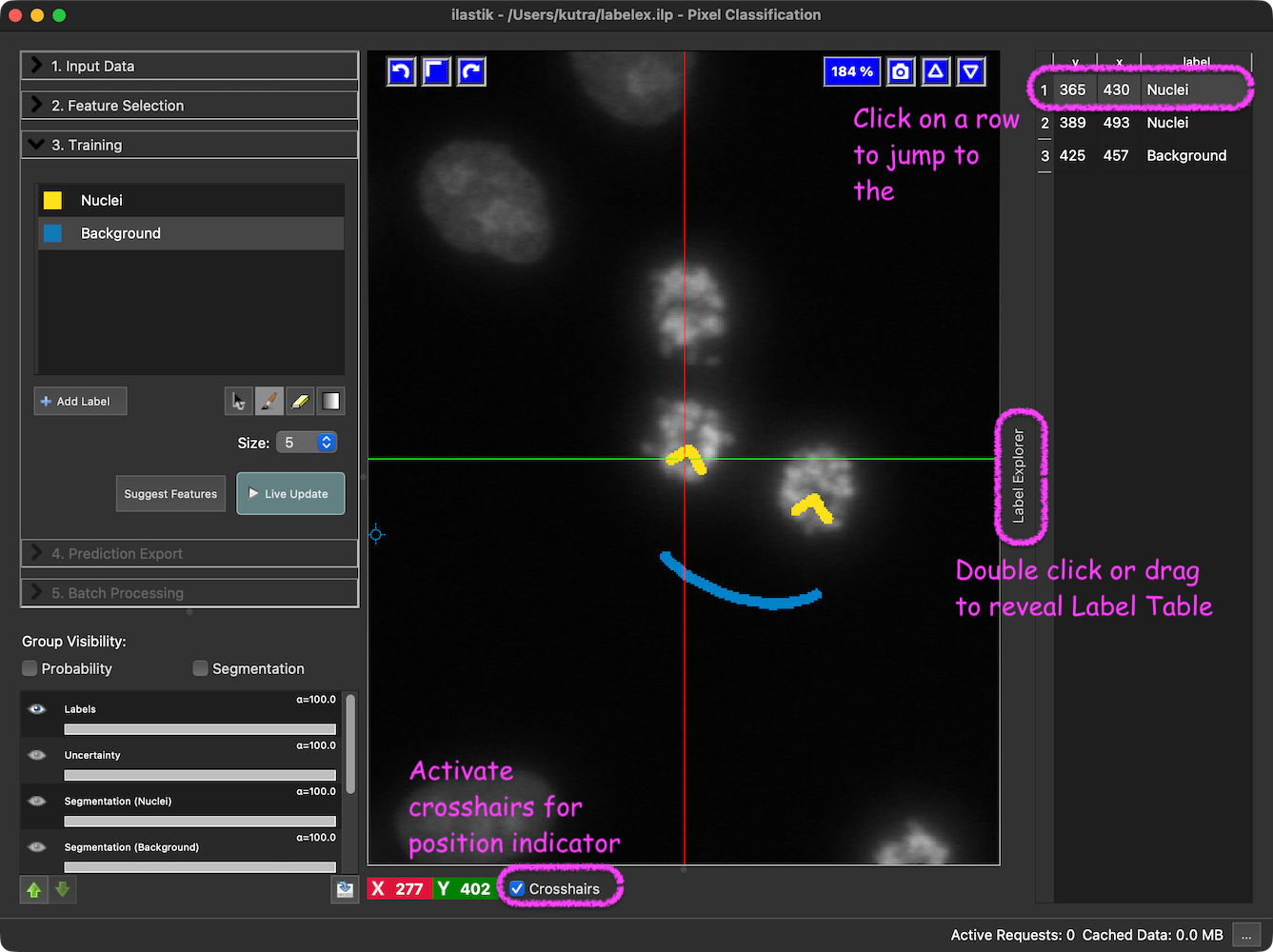 Some steps in ilastik involve labeling your data, either in the form of brush stroke annotations (e.g. in Pixel Classification, Autocontext, Carving), or class assignments for objects (in Object Classification and Tracking). To quickly navigate between different manual annotations, these steps in each ilastik workflow have a “Label Explorer” on the right side next to the viewer. The Label Explorer can be opened by either double clicking on the Label Explorer caption, or clicking and dragging towards the center. Each row in the table represents an annotation label. Clicking on the row will jump to the specific position in the central view. You can indicate the position of the label more clearly by activating the Crosshairs with the checkbox in the lower left. The Label explorer can be closed by double clicking the Label Explorer caption or clicking and dragging the divider towards the right.