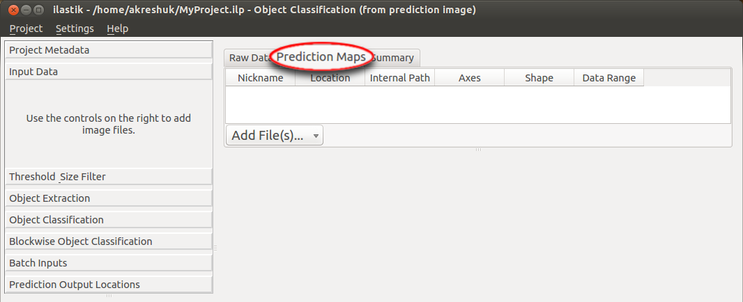 This section only applies if you are in the “Object Classification [Inputs: Raw Data, Pixel Prediction Map]” workflow.
